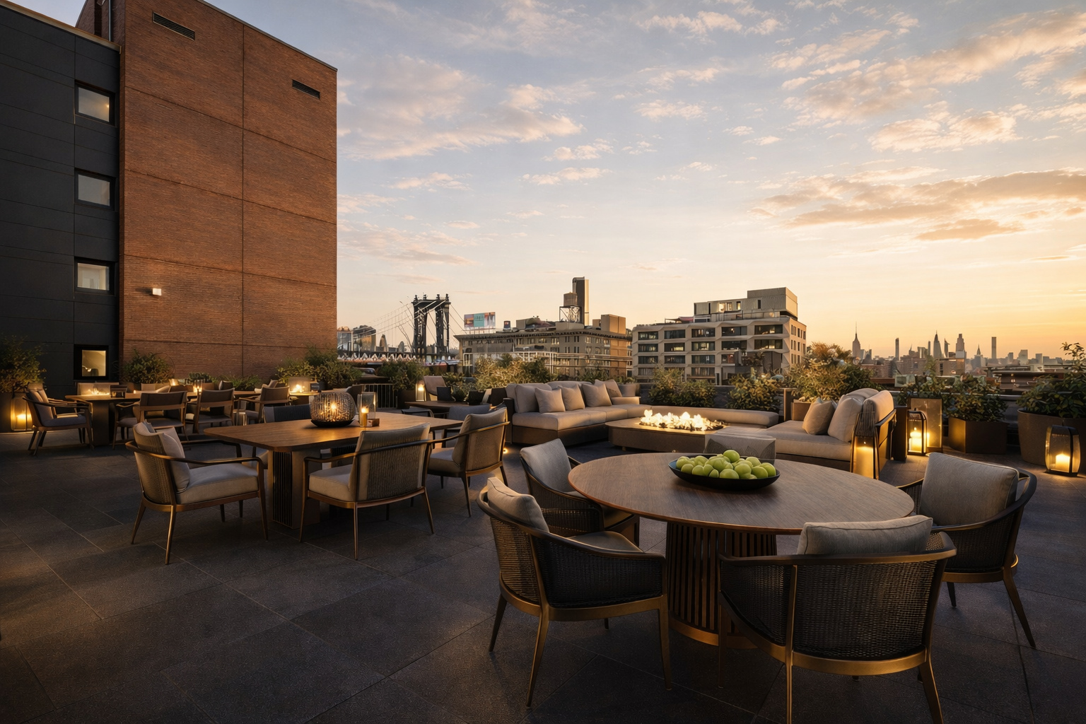 At 181 Front Street, luxury living extends well beyond individual homes. Residents enjoy an attended lobby and a fitness center that encourages wellness without leaving home. A sweeping rooftop terrace offers panoramic views, from the Brooklyn skyline to the East River. Additional amenities include a children’s play area, bicycle storage, a stroller room, and on-site parking.